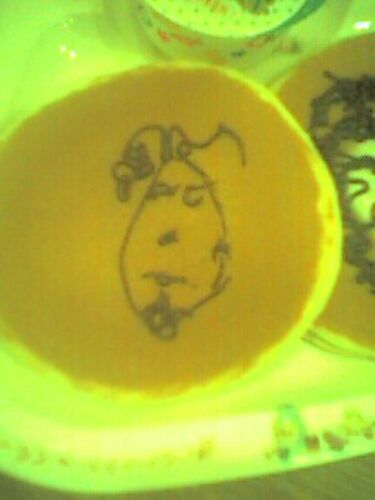 息子がチョコレートでホットケーキの上に画いた絵です。 すごくおかしかったので、載せてみました。本人いわく「自分」だそうです。
