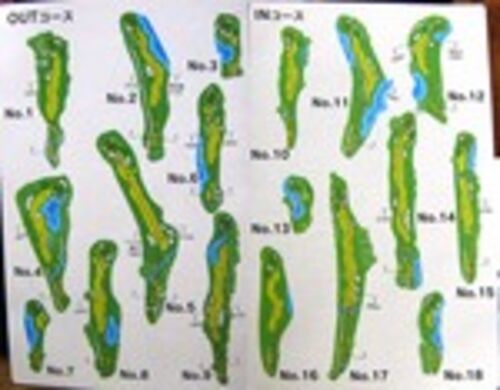 ということで5日の朝7:30スタート。とにかく風が強くて寒い。しかもグリーンがカチコチに凍ってて球が乗っても跳ねて転がって全然とまらなーい。 それに下のコースレイアウトを見てください。なんか池多くねぇ?難しくねぇ? スコア表 INコーススタートです…