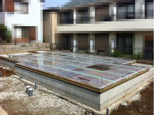 今日の朝、土台を確認してきました。 昨夜は雨が降ったので、養生シートの上がぬれてます。 ぐるっと周りを見てみたのですが、お風呂の断熱材が切られています。 これは折れた感じではないので、意図してだとは思いますが、明日営業さんに聞いてみたいと思い…